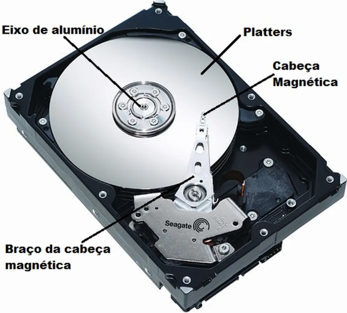 O HD funciona como uma espécie de “disco” que gira em alta velocidade dentro do computador. Uma agulha lê e grava as informações nesse disco, de forma parecida com um toca-discos antigo. Quanto mais rápido o disco gira (medido em RPM), mais rápido o HD consegue acessar os arquivos.